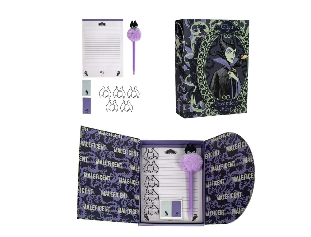 Libera tu creatividad con un toque de estilo oscuro y sofisticado gracias a este set de papelería inspirado en las Villanas de Disney. Con detalles que capturan la esencia de personajes icónicos como Maléfica, Úrsula y Cruella de Vil, este set es perfecto para añadir un aire misterioso y poderoso a tus apuntes y proyectos.