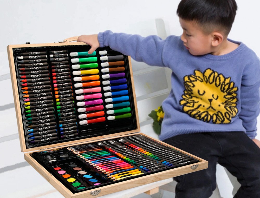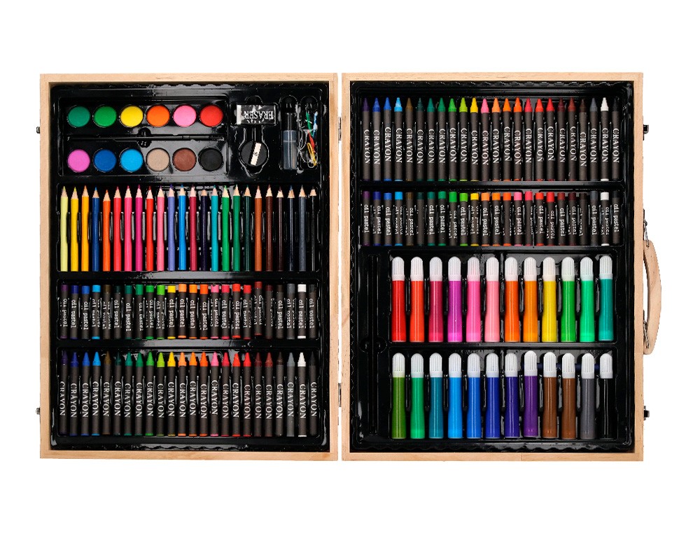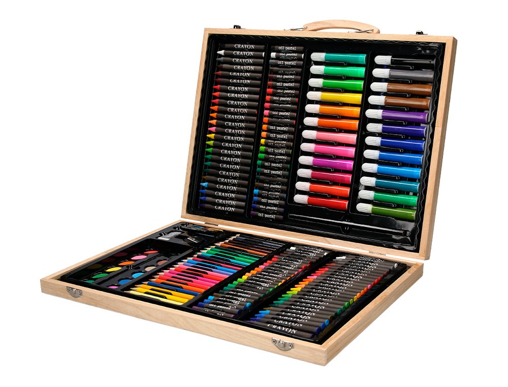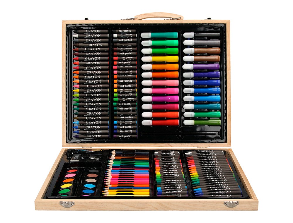 Conjunto de dibujo y coloración en elegante estuche de madera: elementos esenciales creativos para dibujar, colorear y hacer en cualquier momento y en cualquier lugar. Contenido: rotuladores de colores, lápices de colores, ceras de colores, ceras blandas de colores, colores de acuarela, clips, lápiz, pincel, pegamento, goma, sacapuntas, cola blanca y paleta.