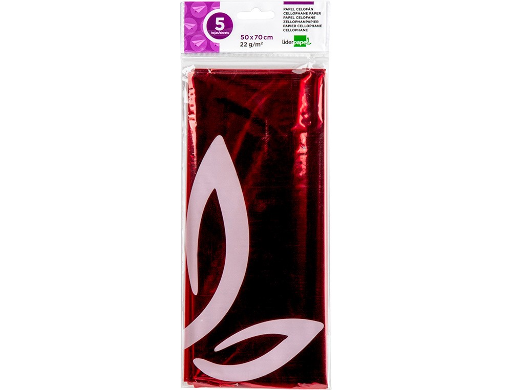 Papel celofan liderpapel 50x70 cm 22 g bolsa de 5 hojas rojo