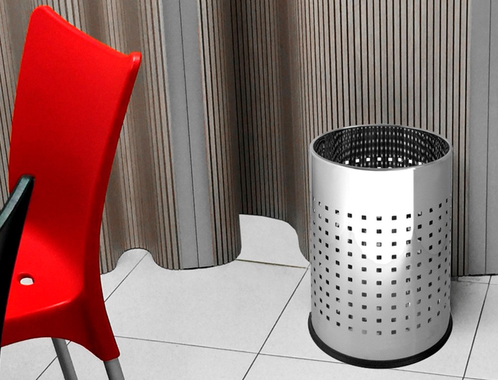 Papelera metálica con forma redonda. Aro inferior fabricado en PVC. Acabado cromado. Perforada. Capacidad: 12 litros. Medidas: Ø 25 x 32,5 cm.