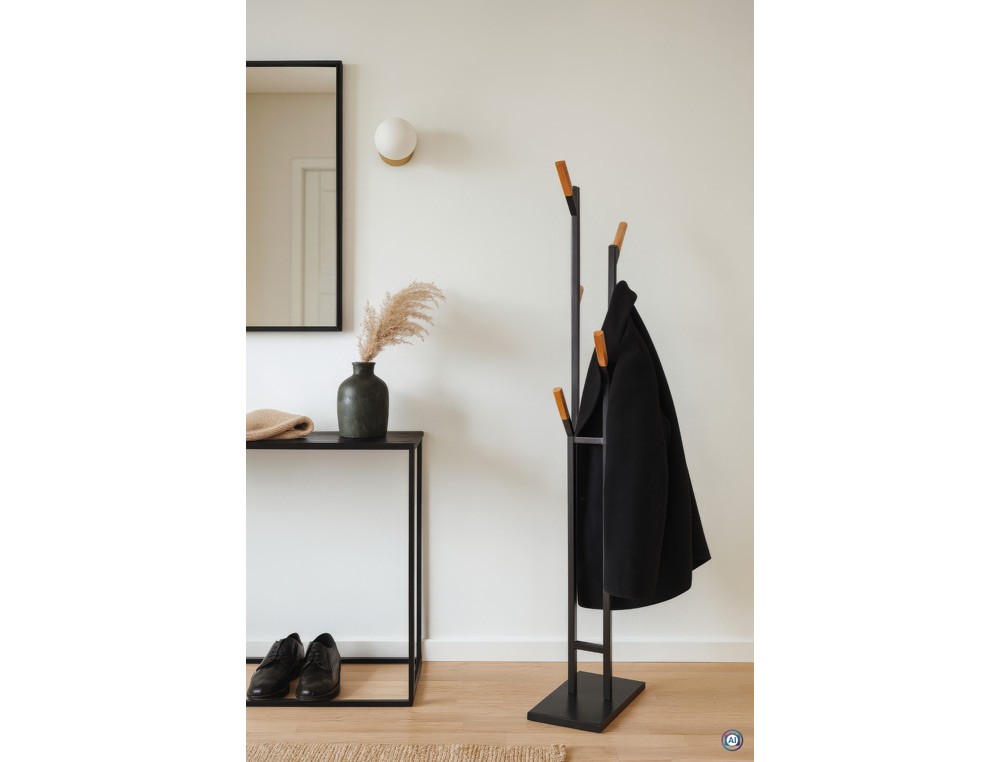 Perchero de pie de diseño en acero y madera, moderno y que ahorra espacio.Ganchos modernos de bambú natural. Bien pensado: los ganchos dispuestos d e forma escalonada distribuyen la carga y permiten un acceso cómodo desde todos los lados. Sujeción segura: 6 barras de metal y bambú. Columnas con sistema de doble barra en acero con recubrimiento de polvo negro mate. Gran base de madera recubierta de melamina. Ideal y compacto para entradas, oficinas o el hogar. Se integra discretamente en cualquier entorno. Columnas de 2x2 cm con travesaños para mayor estabilidad. Protección: base de 48 x 23 x 2,5 cm con almohadillas antideslizantes que cuidan el suelo.Montajerápido y sencillo. Reciclable: desmontar y devolver al ciclo de reciclaje . Envase ecológico reciclable, sin plástico.