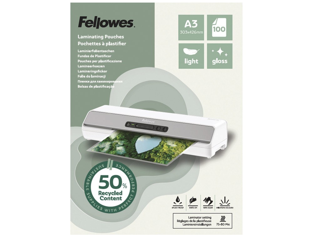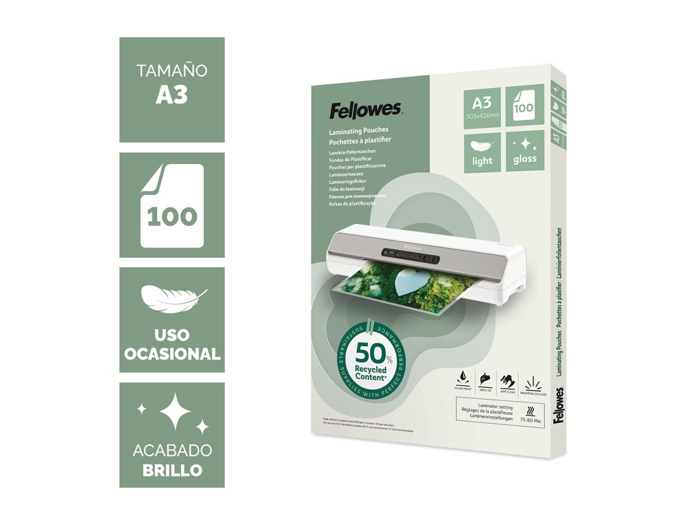 Bolsa de plastificar fellowes recicladas brillo din a3 80 mc pack de 100 unidades