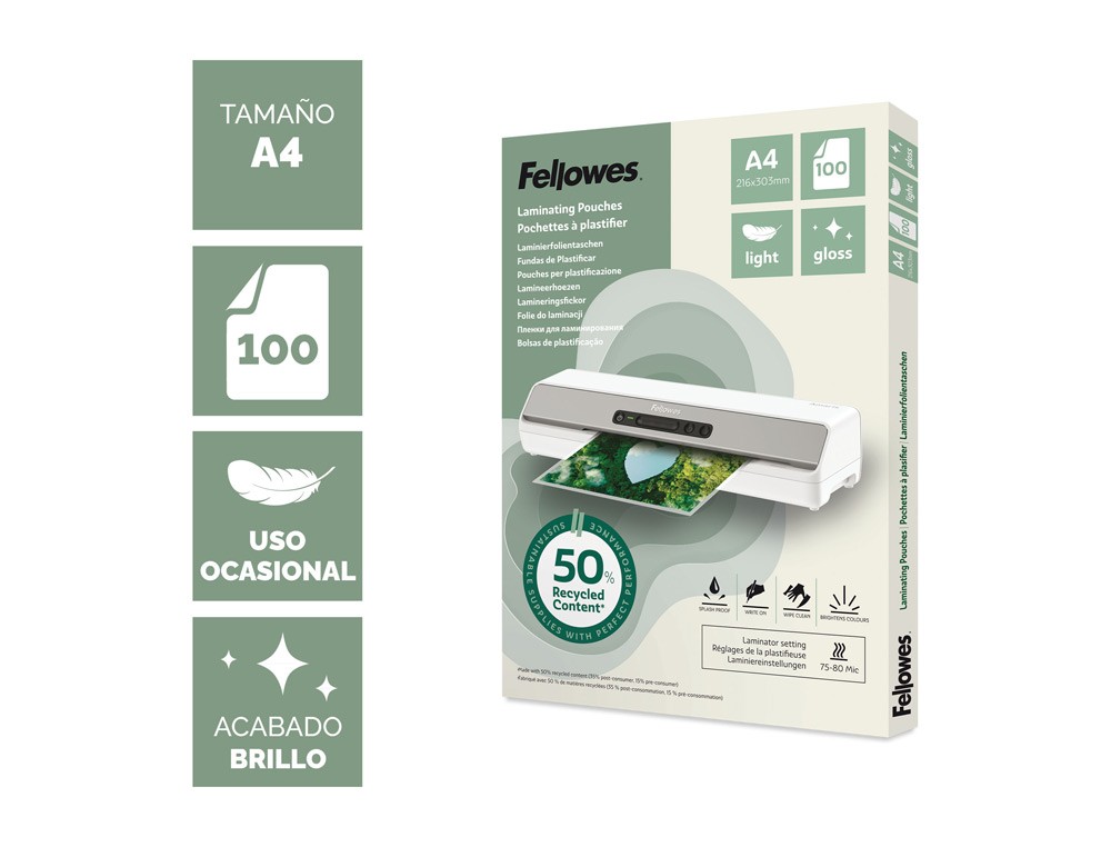 Bolsa de plastificar fellowes recicladas brillo din a4 80 mc pack de 100 unidades