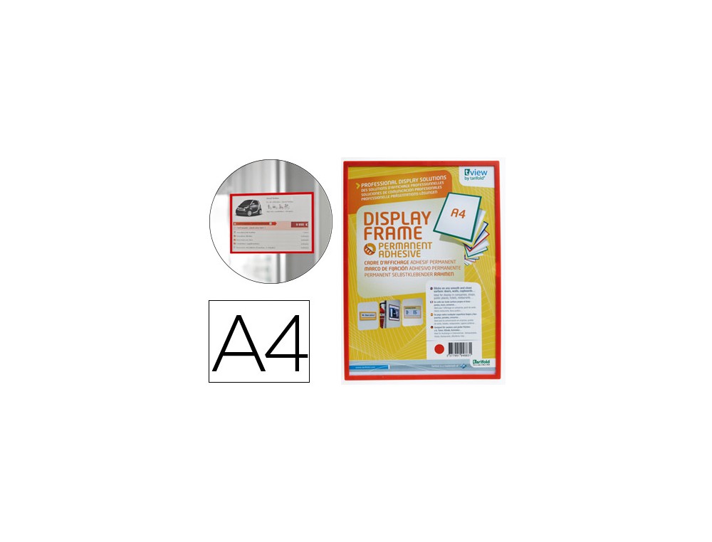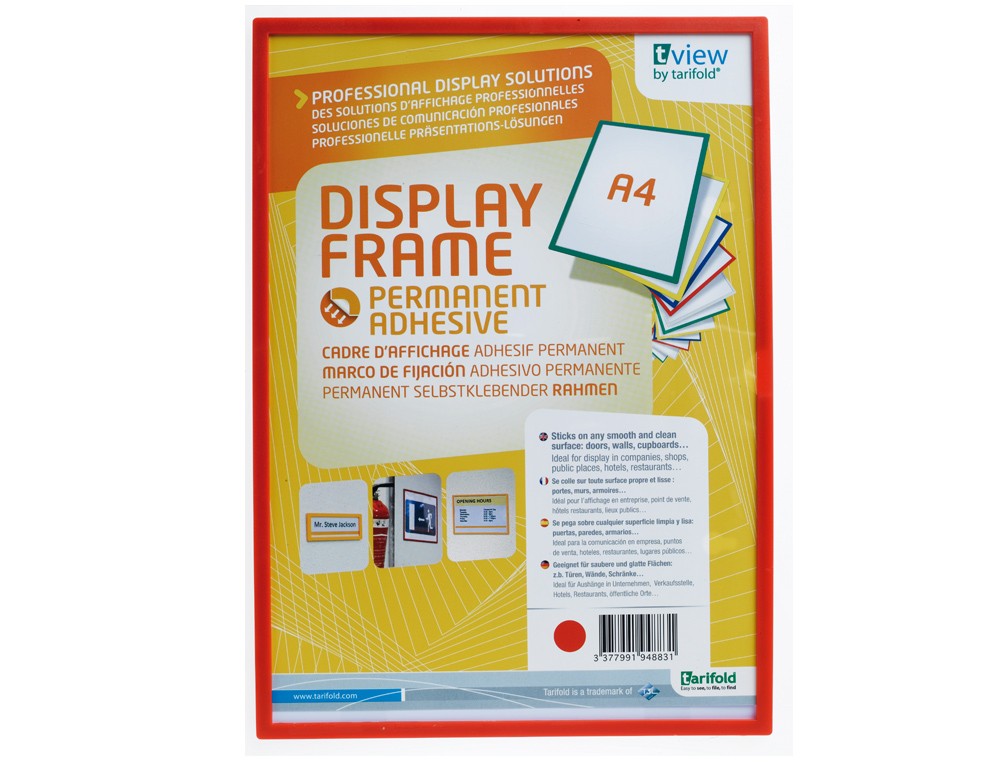 Marco de identificación ligero y robusto. Para colocar fácilmente sobre cualquier superficie lisa. Fijación adhesiva sin herramientas. Fabricado en plástico ABS irrompible. Formato DIN A4.