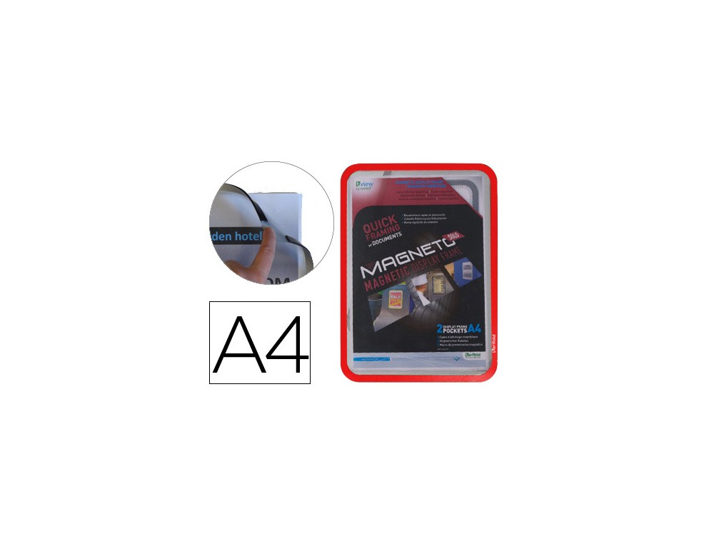 Práctico sistema imantado, rápido intercambio de documentos. Fabricado en PVC 300 micras y 4 bandas magnéticas en el dorso para su adherencia en cualquier superficie metálica. Uso: portaprecios, instrucciones, horarios, etc. Formato DIN A4. El pack de 2 marcos.