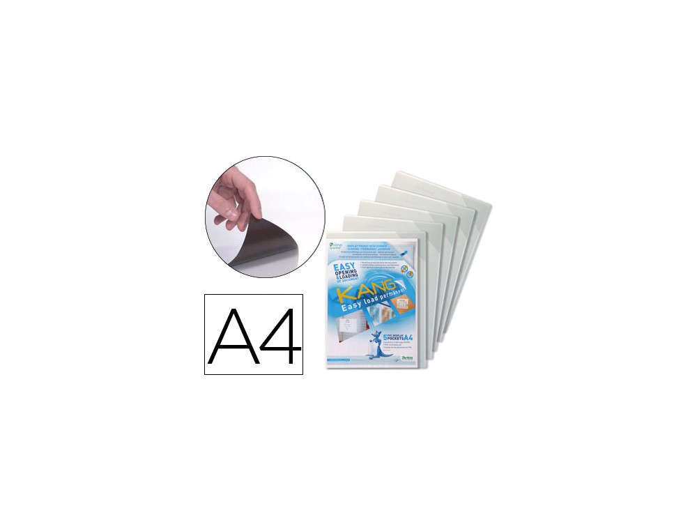 Funda en PVC rígida y antirreflejo. Dos modelos disponibles: fijación adhesiva permanente o magnética en todo el dorso de la funda. Apertura en L y cierre en esquina, fácil inserción de los documentos. Vertical/horizontal. Formato DIN A4. El pack de 5 sobres.