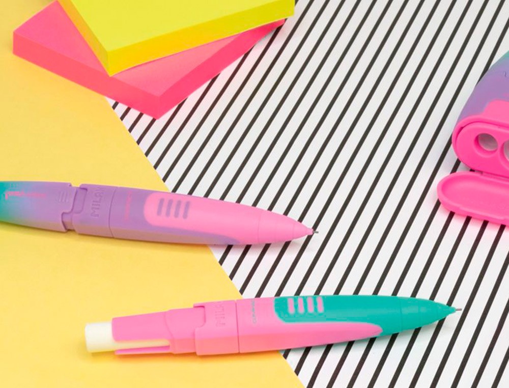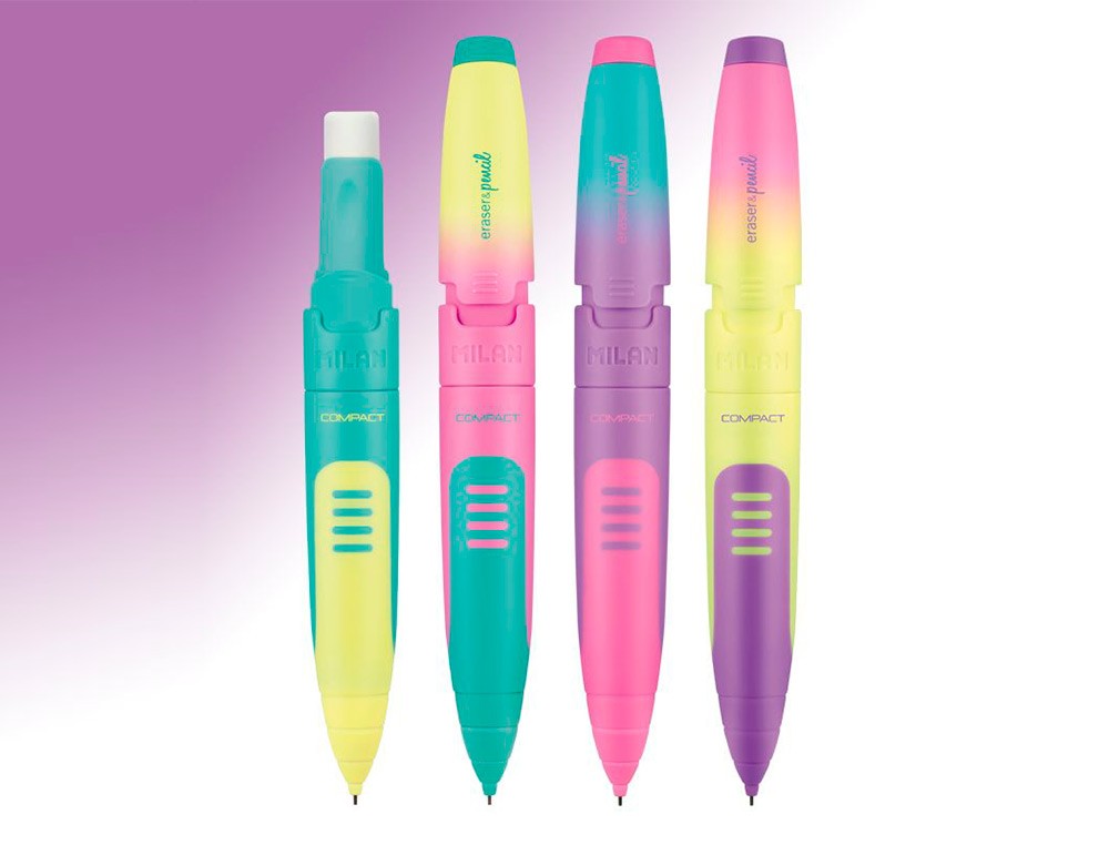Portaminas con goma eraser&pencil COMPACT serie Sunset. Mina de grafito 0.7 mm dureza 2B, gruesa y suave, que facilita la escritura y es también apropiada para el dibujo artístico. Goma MILAN extra-grande. Disponible en 4 colores surtidos: amarillo, lila, rosa y verde. Medidas portaminas COMPACT: 13 x 1,8 x 1,6 cm. Gomas y minas de recambio disponibles.