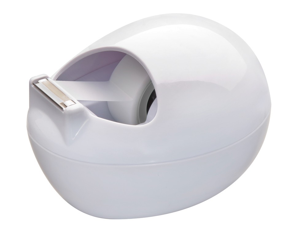 Dispensador diseñado por Karim Rashid. Color blanco. Dispensador de mesa recargable de diseño moderno y actual. Se puede utilizar con una sola mano. Muy estable gracias a la base antideslizante. Cuchilla metálica. Incluye un rollo de cinta Scotch® Magic 7,5 m x 19 mm. Medidas: 110 x 86 x 77 mm.