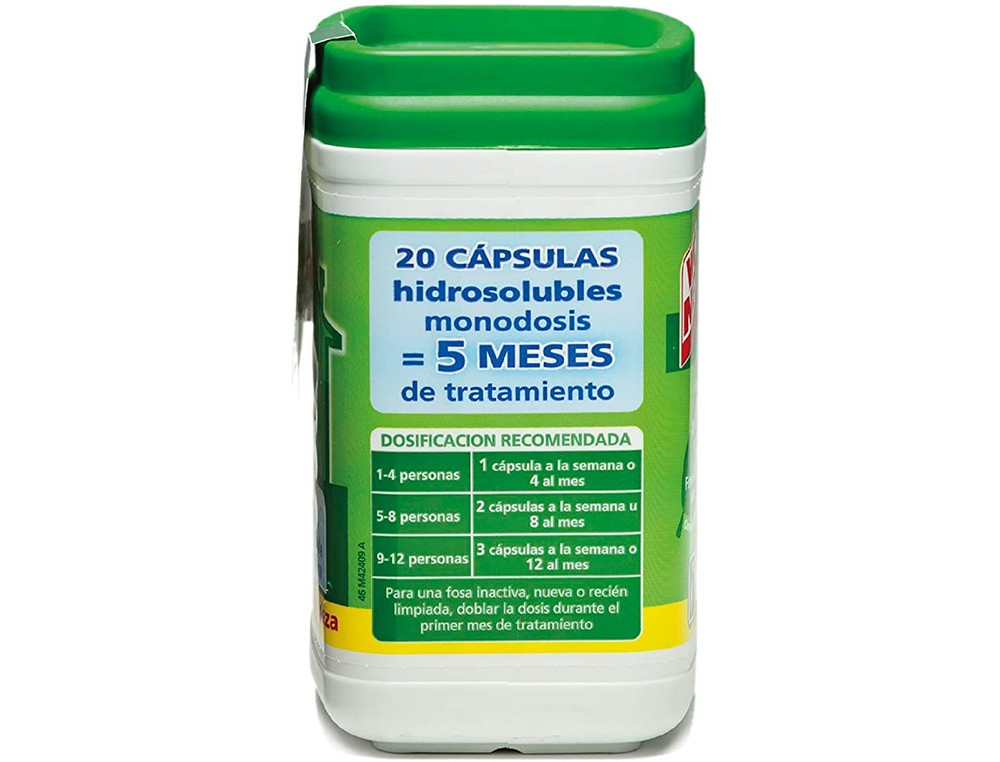 Tratamiento semanal para eliminar olores de fosas sépticas. Evita los malos olores, los atascos y la limpieza. Con enzimas de origen biológico que deshacen los residuos que se acumulan en la fosa séptica y que generan malos olores. 20 cápsulas hidrosolubles para 5 meses de tratamiento semanal.