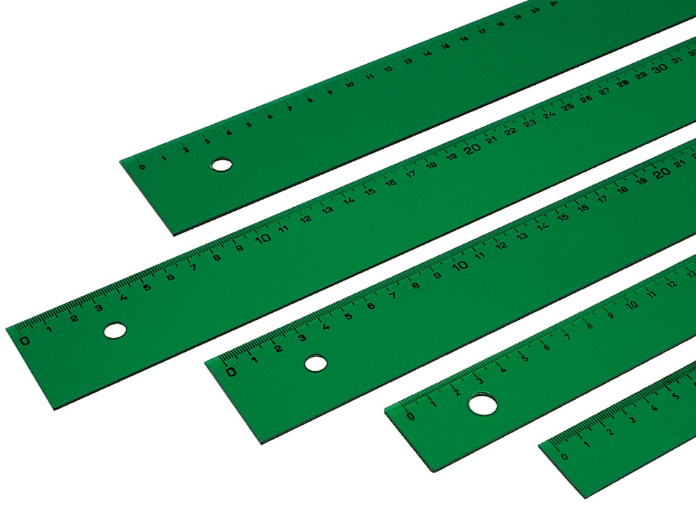 Regla de gran calidad para estudios y oficinas. De plástico verde transparente y graduaciones grabadas a prueba de emborronamiento.