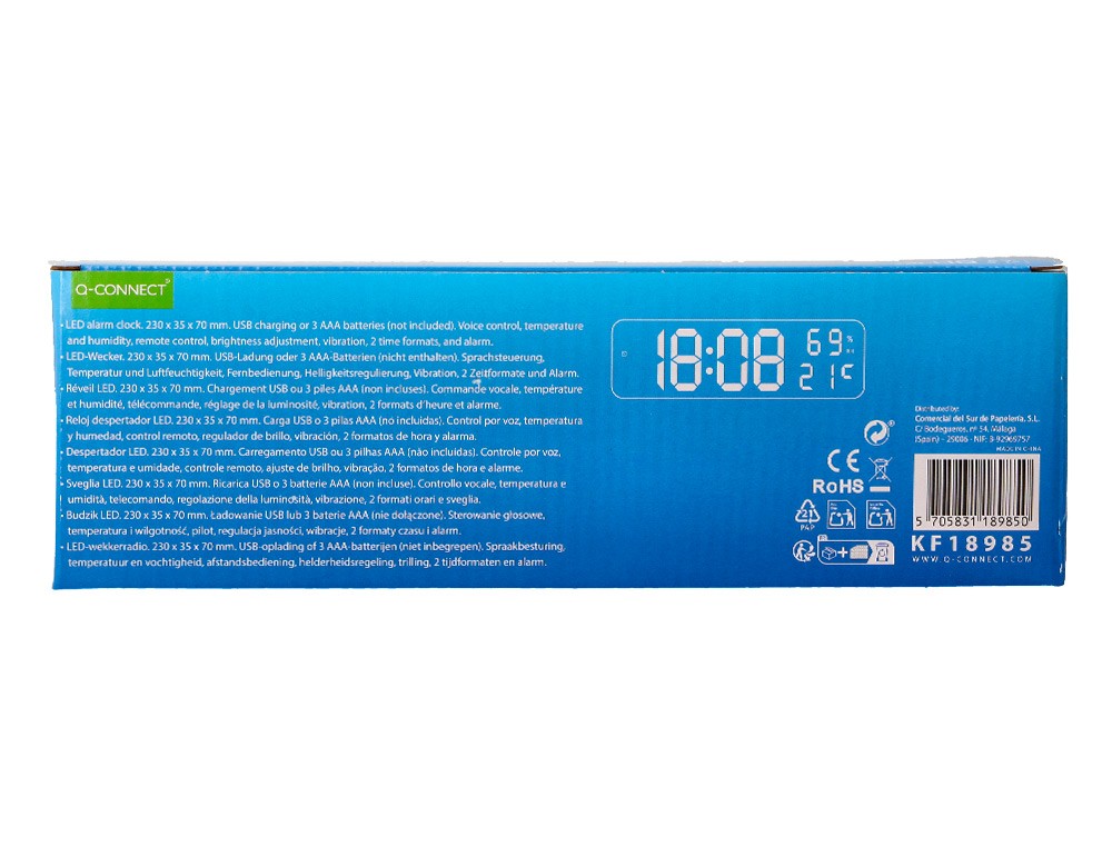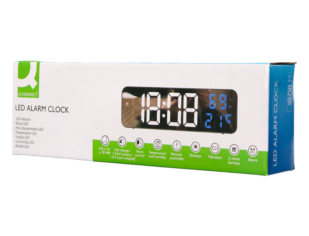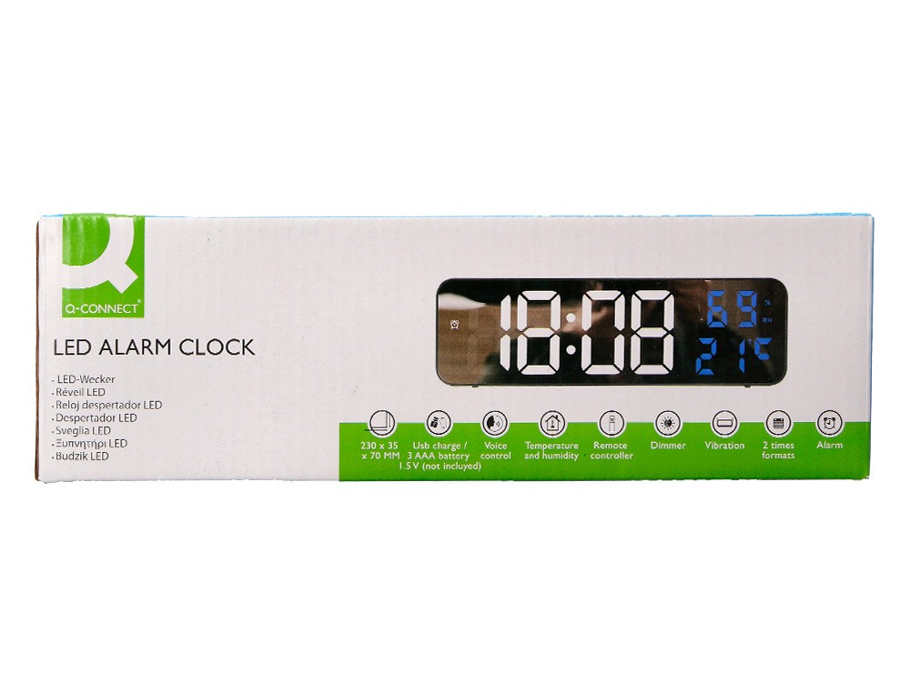 La colección de relojes digitales Q-Connect ofrece una perfecta combinación entre un diseño moderno y funcionalidad, perfectos para oficina, dormitorios o salas de estudio. Reloj digital de sobremesa o pared con 2 alarmas,vibración y formato 12/24 h. Mide temperatura (°C/°F) y humedad, se activ a por sonido para ahorro energético y tiene LED blanca y verde con 3 niveles de brillo. Incluye cable USB y funciona solo conectado a la corriente, con 3 pilas AAA (no incluidas) mantiene la hora en memoria. Medidas: 230 x35 x 70 mm.