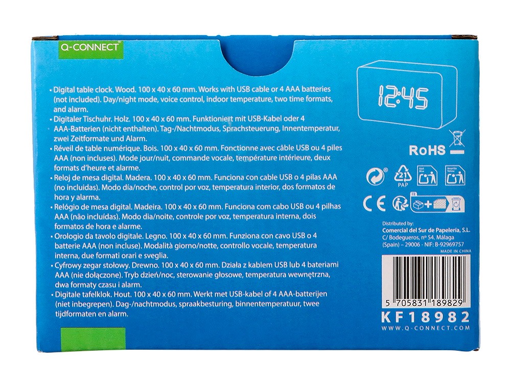 La colección de relojes digitales Q-Connect ofrece una perfecta combinación entre un diseño moderno y funcionalidad, perfectos para oficina, dormitorios o salas de estudio. Este reloj incorpora 3 alarmas, vibración y ajuste de luz en 3 niveles con modo día y noche. Muestra hora o alterna hora, fecha y temperatura (°C/°F) y se activa por sonido, palmada o ruido para ahorrar energía. Pantalla LED roja, cable USB incluido y funciona solo conectado a la corriente, las 4 pilas AAA (no incluidas) mantienen la memoria del reloj. Medidas: 100 x 40 x 60 mm.