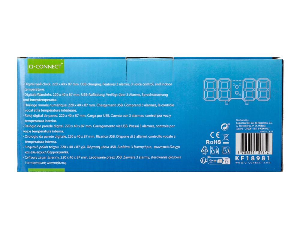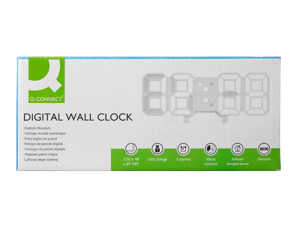 La colección de relojes digitales Q-Connect ofrece una perfecta combinación entre un diseño moderno y funcionalidad, perfectos para oficina, dormitorios o salas de estudio. Este reloj cuenta con 3 alarmas, temporizador y vibración, además de ajuste de luz en 3 niveles (L1-L3). Formato 12/24 h y medición de temperatura en °C/°F. Su pantalla se activa por sonido, palmada o ruido, facilitando la lectura en cualquier momento. Pantalla LED blanca, cable USB incluido y funciona solo conectado a la corriente. Medidas: 220 x 40 x 87 mm.