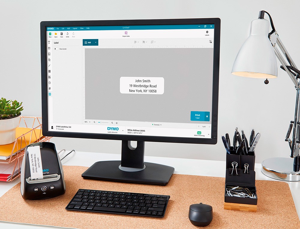 Impresora de etiquetas sin tinta para PC y Mac®. Utiliza la tecnología de impresión térmica directa, sin necesidad de tinta o tóner. Cree e imprima etiquetas de direcciones, para carpetas de archivos, códigos de barras y más desde su PC o Mac® a través del software DYMO® Connect. Imprime hasta 62 etiquetas por minuto. Diseño gráfico nítido con una resolución estándar de 300 x 300 DPI. Incluye: LabelWriter 550, 1 rollo básico de etiquetas de direcciones (28 mm x 89 mm), un adaptador de CA, un cable de alimentación, un cable USB, una guía de referencia rápida y 2+1 años de garantía limitada. Medidas: 160 x 140 x 270 mm. Peso: 1,3 kg.