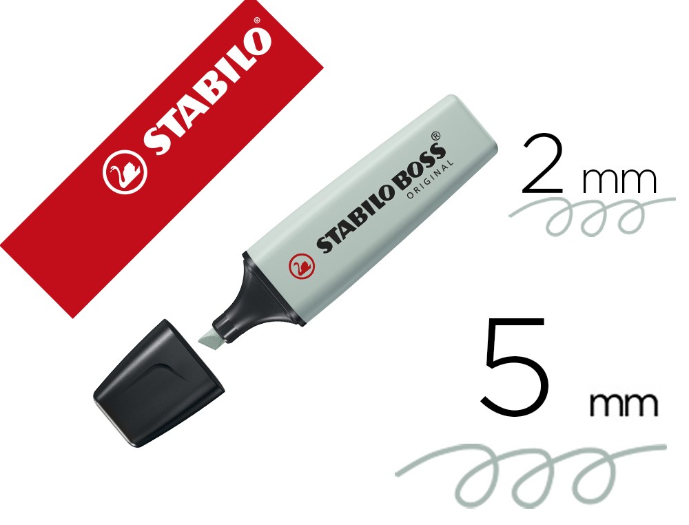 Rotulador fluorescente Stabilo Boss Original Pastel Nature Colors. Antisecado, hasta 4 horas destapado sin secarse para poder concentrarse en el trabajo. Resistente a la luz en todo tipo de papel normal, térmico y fotocopias. Punta biselada. Trazo de 2 a 5 mm. Color verde tierra.