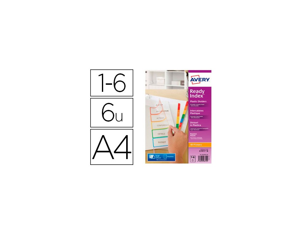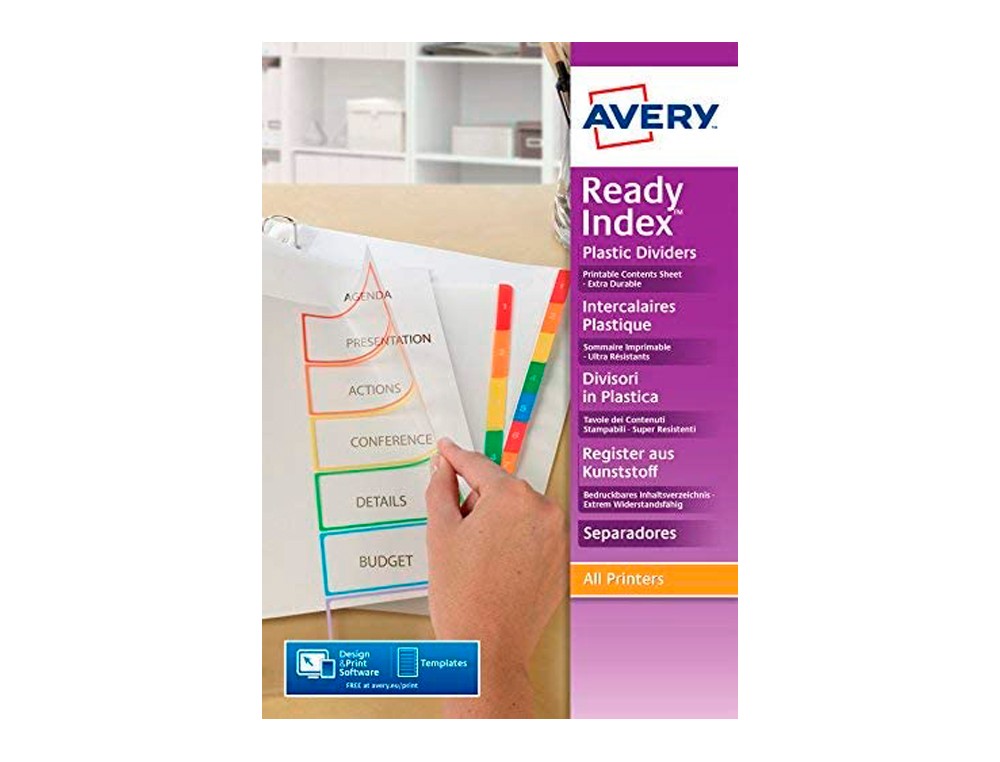 Separadores de colores en polipropileno. Ultra resistentes y duraderos, resisten al agua y a la humedad. Tabla de contenido personalizable y 6 o 12 pestañas de colores. Gratis en cada caja , etiquetas para los archivadores. Formato Din A4.