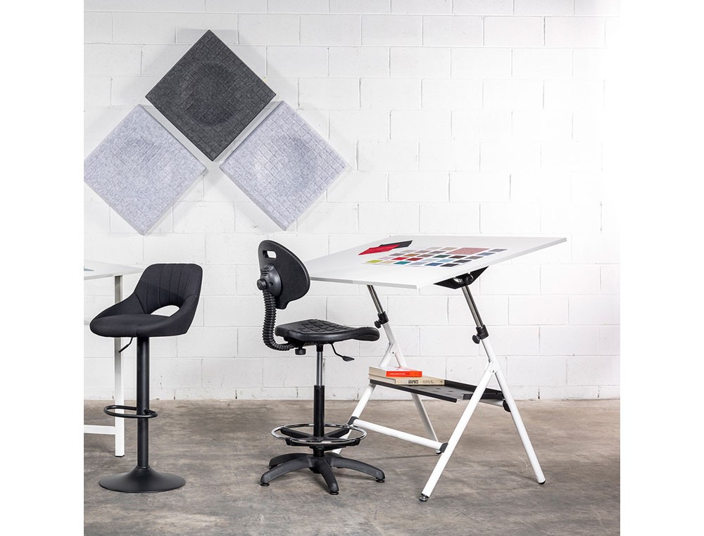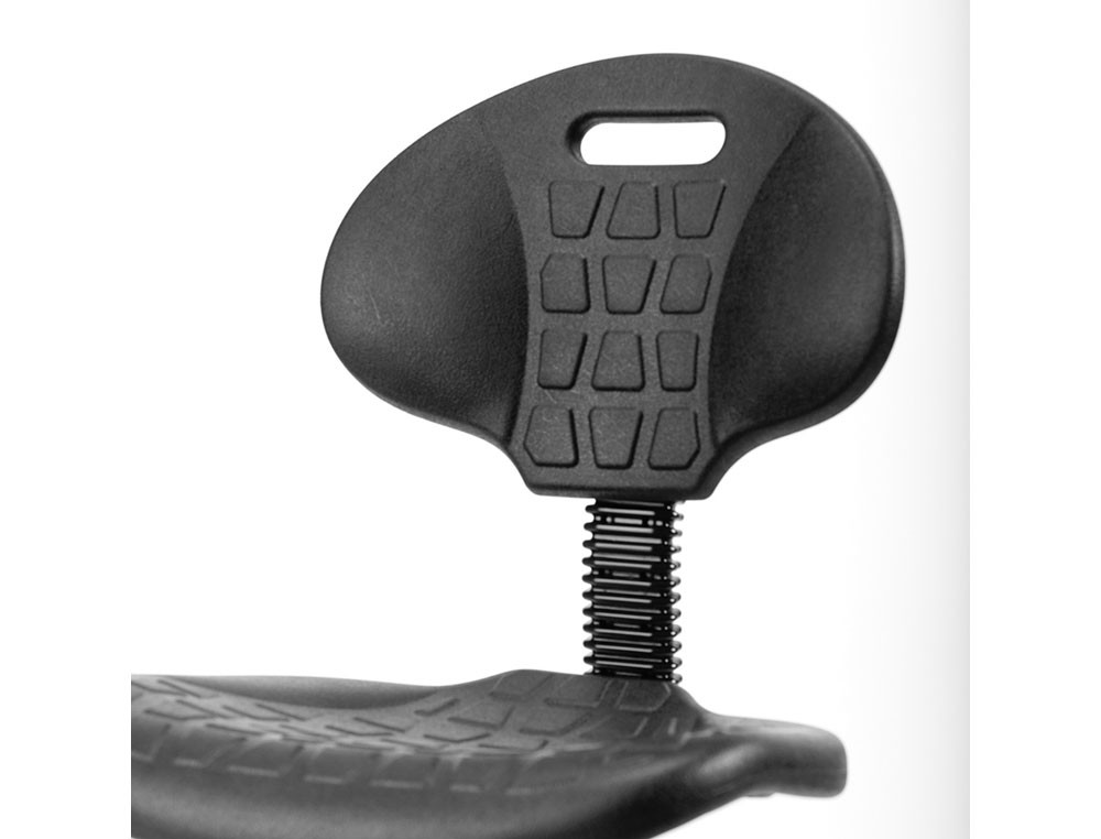 Uso industrial de alta resistencia. Asiento y respaldo: en polímero técnico de color negro. Pistón: de gas de largo recorrido. Base: polímero técnico con tacos antideslizantes. Aro reposapiés regulable en altura. Admite ruedas opcionales. Altura del taburete: 93 + 25 cm. Altura del respaldo: 33 cm. Altura del asiento: 56-81 cm. Ancho del asiento: 42 cm. Profundidad del asiento: 47 cm. Horas de uso: 8 horas. Peso del taburete / peso máximo soportado: 11,90 kg / 125 kg. Cumple normativa UNE-EN 16139