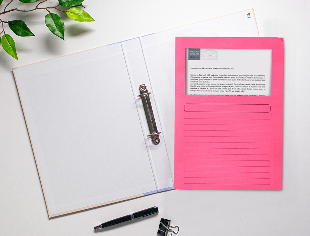 Fabricada en cartulina de 120 g/m². Tapa con ventana transparente. Formato DIN A4.