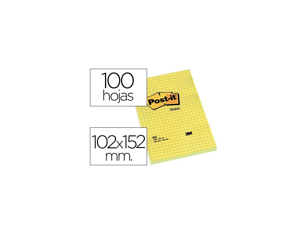 Cuadriculada. Indicada para recordar tareas a hacer. Se pega y despega muchas veces sobre cualquier superficie sin dejar rastro y sin dañar el documento original. Color amarillo. Medidas: 102 x 152 mm. El bloc de 100 hojas.