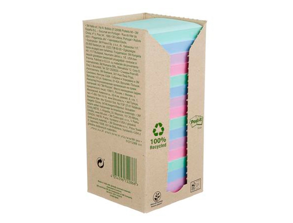 Las notas recicladas Post-it están fabricadas 100 % con fibras de papel reciclado y un adhesivo de fuentes renovables, fabricado al 60 % con plantasque vuelven a crecer cada año. Tienen la certificación PEFC RECYCLED, se obtienen de bosques certificados, renovables y gestionados responsablemente. Torre con 16 blocs. 100 hojas. Colores surtidos. Medidas: 76x76 mm.