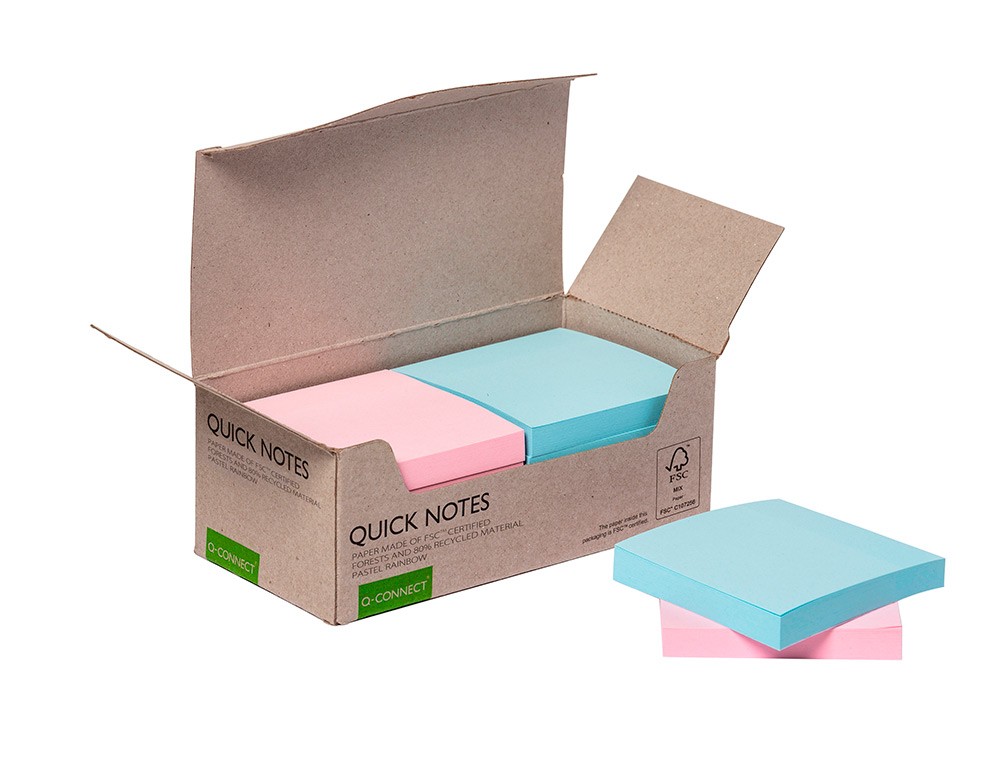 Bloc de notas adhesivas quita y pon q-connect 76x76 mm 100% papel reciclado colores pasteles en caja de carton