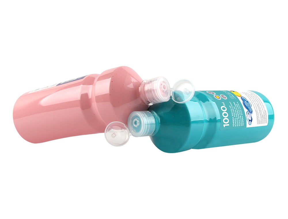 Témpera escolar lista para usar. Ideal para uso escolar. Adecuada a partir de los 3 años de edad. Superlavable. Con cierre de seguridad. Colores brillantes. La botella de 1000 ml.
